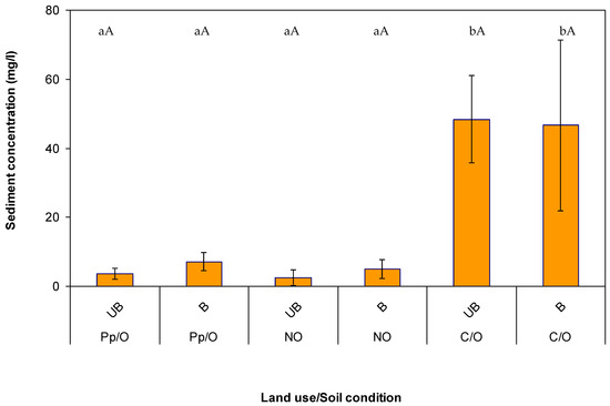 Sediment concentration measured using a rainfall simulator in different land uses (Pp/O = pine plantation on ancient oak forest; NO = natural stand of oak; C/O = cropland on ancient oak forest) and soil conditions (UB = unburned soil; B = burned soil) in the experimental area (Zagros forests, Western Iran). Different lowercase letters indicate significant differences among land uses, while different capital letters indicate significant differences between soil conditions, according to Tukey’s test (at p < 0.05).