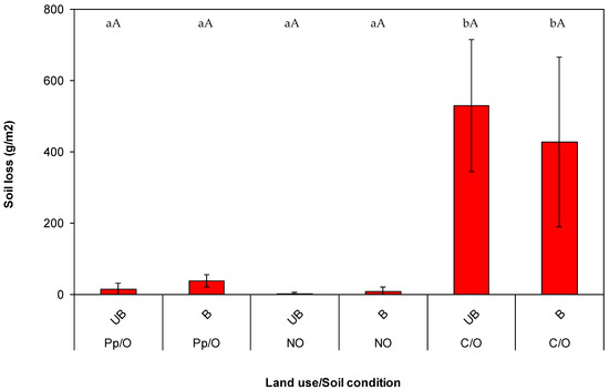 Soil losses measured using a rainfall simulator in different land uses (Pp/O = pine plantation on ancient oak forest; NO = natural stand of oak; C/O = cropland on ancient oak forest) and soil conditions (UB = unburned soil; B = burned soil) in the experimental area (Zagros forests, Western Iran). Different lowercase letters indicate significant differences among land uses, while different capital letters indicate significant differences between soil conditions, according to Tukey’s test (at p < 0.05).