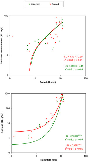 The correlations between the surface runoff and sediment concentration were found significant (p < 0.05). The linear correlation was found stronger (r2 = 0.71) for unburned soils, while it was weaker (r2 = 0.38) for the burned soil conditions. The soil loss was also revealed linearly correlated to the sediment concentration, as denoted by the highly significant coefficient of determination (r2 > 0.90). Finally, an exponential trend between the soil loss and runoff was found, whereas, the value of r2 was observed 0.64 soil) and 0.82 for the (burned and unburned sites respectively (Figure 6).