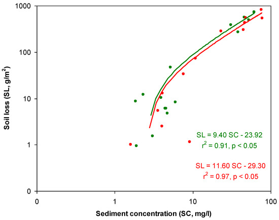 The same trends as of the infiltration and surface runoff were detected for the erosion. In more detail, the soil loss was much higher in the cropland (on an average 30-fold compared to the values measured in the forest lands), while the erosion in the pine plantation was three-fold to that of oak forest. The reason of these high differences in the soil loss among the investigated land uses can be due to the high sediment concentration measured in the cropland, which is much higher than in the forest lands. This explanation has been justified with the derived significant correlation between the soil loss and sediment concentration in our study. It is well known that the agricultural soils are subject to tillage and other cultivation operations, which commonly alter the physical properties (e.g., [45]). These operations break down the soil aggregate stability, which makes the croplands more prone to rainsplash detachment and sediment transport due to the overland flow [38,42].