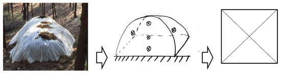 After the preparation of composting raw materials, we started composting in early May, and the site was selected as the original place inside the forest. We used plastic film to seal the compost (Figure 1) to control the evaporation and heat dissipation of water and effectively retain the heat in the reactor. According to the settings of different treatment groups, raw materials and additives were mixed evenly and stacked into cuboids of about 5–7 m3; We placed the TDR detector (the TDR model is EM50 with ECH2O soil monitoring system, METER, Washington, the United States) detection line in each reactor and covered it with plastic agricultural film. The TDR tester was set to record data every 30 min and run for 24 h. When it was detected that the temperature of the pile had a peak value and continued to decline, it was turned over once and covered with agricultural film again until the end of composting.