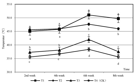 The composting process lasted for 8 weeks, and the average temperature of T1 and T2 was always higher than that of the other two treatments (Figure 2). The temperature of each treatment first increased with the increase of stacking time, reached its peak around the 6th week, and then decreased gradually. The average temperature variation range of T1 and T3 was relatively large, with a temperature difference of 4–6 °C; T1 had the highest peak temperature, more than 50 °C, followed by T2. The average temperature of T4 varied from 35.6 °C to 38.4 °C, with the smallest variation range and the lowest peak value. The difference between the peak temperature of T1 and that of T4 was 12.6 °C. In terms of significance, from the beginning of composting to the second week, there was a significant difference between the average temperature of T1 and T2 and the other two treatments (p < 0.05). At this time, T1 and T2 reached more than 45 °C. There was a significant difference between the four treatments from the peak temperature in the 6th week to the end of composting in the 8th week. In conclusion, when priming was used as an additive, the temperature changed most obviously in the composting process, and the peak average temperature was the highest, which could reach the high-temperature decomposition stage; the treatment with common compost had the second highest peak temperature.