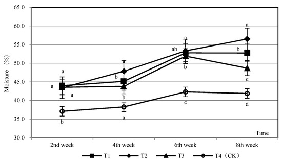 In the whole composting cycle, the average moisture content of T2 varied by 14%, and the peak reached 57%, with the largest variation and the highest peak. In contrast, T4 had the smallest change, only 4%, which was 1.2 times different from the peak moisture content of T2 (Figure 3). The average moisture content of T2 always maintained an upward trend. T1, T3, and T4 increased first and then stabilized, and the peak appeared in the sixth week. In terms of significance, from the beginning of composting to the second week, the average moisture content of T1, T2, and T3 gradually showed differences from T4 (p < 0.05). By the 8th week, there were significant differences among the four treatments. The average moisture content of T2 and T1 was more than 50%, and the order from high to low was T2 > T1 > T3 > T4. There was no significant difference between T1 and T3. On the whole, the addition of common compost had the greatest impact on the change of water content in the composting process and at the end of composting, followed by the addition of a detonating agent.