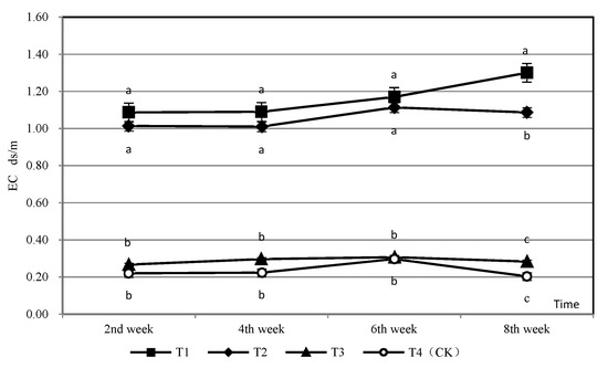 Change of EC in different treatments. T1: adjust C/N, C/P + 0.2% priming; T2: adjust C/N, C/P + 0.2% common compost; T3: adjust C/N, C/P; T4 (CK): raw material grinding of tending material. Different letters indicate a significant difference at the 0.05 level.