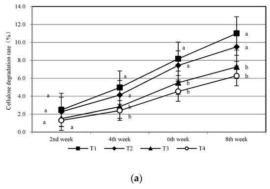 From the beginning of composting to the end of the 8th week, the decomposition rate of lignocellulose in each group increased with the accumulation of composting time (Figure 5). The change of cellulose decomposition rate in each stage of composting was similar and showed a continuous growth state, from high to low, T1 > T2 > T3 > T4; at the end of composting, the decomposition rate (Figure 5a) of T1 cellulose was 1.7 times that of T4. The lignin decomposition rate (Figure 5b) of T2 was the highest in the early stage of composting, which was slightly lower than T1 after 6 weeks. Compared with T4, the lignin decomposition rate of T1 increased by 5.6%~12.5% in the whole cycle and reached 25.5% at the end of composting. The decomposition rates of T1 and T2 hemicellulose were always significantly higher than T3 and T4 and began to slow down at the 6th week. In the whole cycle, the hemicellulose decomposition rate (Figure 5c) of T2 increased by 18.6%, which was 1.9 times that of T3 and 3.2 times that of T4. It could be seen that the detonator had the most obvious effect on the decomposition rate of cellulose and lignin, and the addition of common compost had a significant effect on the decomposition rate of hemicellulose.