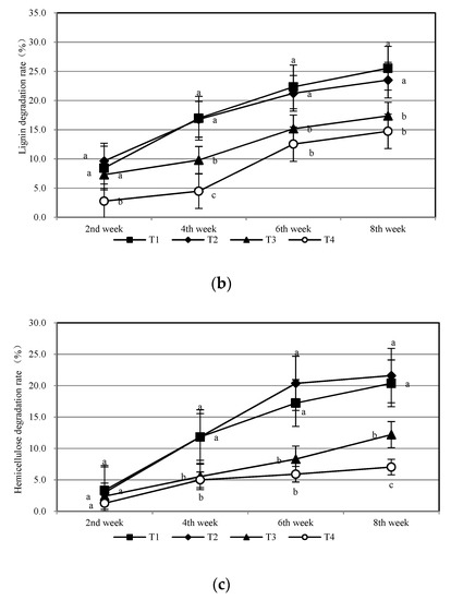 Change of degradation rate of cellulose (a), lignin (b), and hemicellulose (c) in compost with different treatments. T1: adjust C/N, C/P + 0.2% priming; T2: adjust C/N, C/P + 0.2% common compost; T3: adjust C/N, C/P; T4 (CK): raw material grinding of tending material. Different letters indicate a significant difference at the 0.05 level.