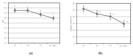 At the end of the 8th week, the pH of T1 and T2 reached more than 7.0, and T1 was the highest, up to 7.5; in contrast, T4 was the lowest, only 5.9 (Figure 6a). There was no significant difference in pH between T1 and T2, but there was a significant difference between T3 and T4 (p < 0.05). The order of compost pH from high to low was T1 > T2 > T3 > T4. The average organic matter content of compost in each treatment was significantly different (Figure 6b). Among them, the average organic matter content of T1 was the highest, up to 52%; the organic matter content of T1 and T2 had a significant difference, and T2 and T3 were up to more than 40%; T4 had the lowest organic matter content, only 30%, which was 1.7 times higher than T1. On the whole, the addition of a detonating agent and common fertilizer had the most obvious effect on the regulation of compost pH and had a great impact on promoting the release of organic matter from the raw material of Oriental Arborvitae tending.