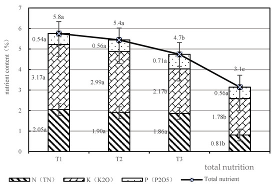 3.2.2. TN, K2O, P2O5, and Total Nutrients