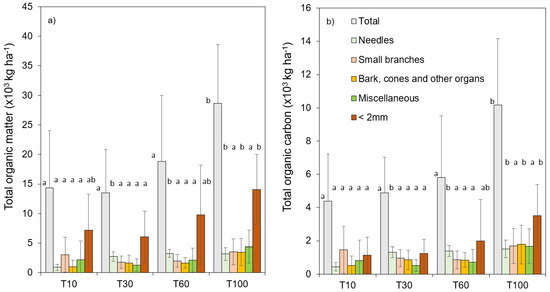 The highest frequency of material smaller than 2 mm (approximately 50%) was consistent across the thinning treatments (Figure 1a). The two-way ANOVAs/Kruskal–Wallis tests revealed a significant effect of thinning intensity on total organic matter and organic carbon, with T100 significantly higher than the rest of the thinning treatments (Figure 1a,b). This reduction effect was also observed for all the fractions but with different magnitudes depending on the thinning intensity and fraction. For instance, the highest organic carbon reduction compared to the control treatment was obtained for the needle fraction in T10 (71%), whereas this reduction was maximum for the miscellaneous fraction in T30 and T60 (69.1% and 57.3%, respectively). In any case, the differences observed in total organic matter were also maintained when comparing organic carbon from the forest floor fractions among the thinning treatments (Figure 1a,b).