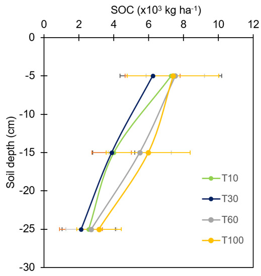 Oxidizable soil organic carbon (SOC, ×103 kg ha−1) as a function of soil depth (cm) and thinning intensity treatment. Thinning intensity was a non-significant factor in the ANOVA, while soil depth was significant at p-value < 0.05. Lines are drawn to improve the visualization of the SOC profile for each thinning treatment.
