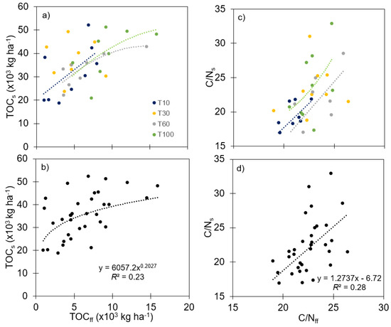 Total organic carbon in soil (TOCs) as a function of total organic carbon in forest floor (TOCff) (a,b). C/N in soil (C/Ns) as a function of C/N in forest floor (C/Nff) (c,d).