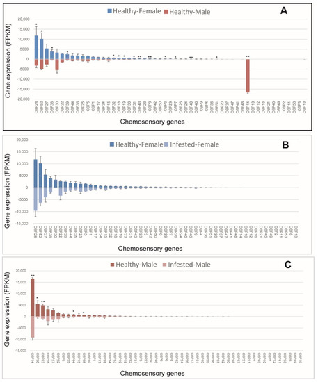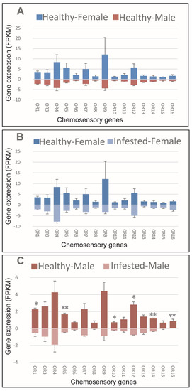 Expression patterns of chemosensory genes in healthy and B. xylophilus-infested M. saltuarius. (A) Differences between sexes of healthy M. saltuarius; (B) Differences between healthy and infested female M. saltuarius; (C) Differences between healthy and infested male M. saltuarius. Transcript levels are expressed as reads per kilobase of exon per million mapped reads (RPKM), and the expression data were shown as mean±SE. The stars above each bar of figure indicate significant differences (p < 0.05 * and p < 0.05 **).