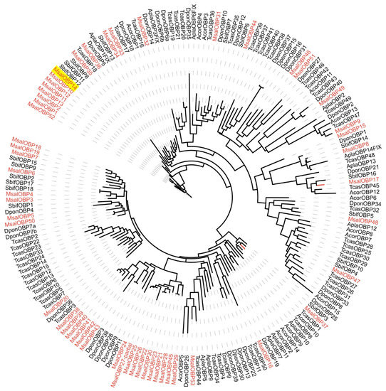 A phylogenetic tree was constructed to analyze the characteristics of OBPs from M. saltuarius, based on orthologs to OBP sequences from several other Coleoptera insects Semanotus bifasciatus [54], Tribolium castaneum [55], Anomala corpulenta [56], Agrilus planipennis, and Dendroctonus ponderosae [57] (Figure 2). OBPs from M. saltuarius seems to be homologous to OBPs of Coleopteran insects whose genomic information are available, and indicates the relative complete identification of OBPs from M. saltuarius. MsalOBP14, which expressed at an especially high level in male adults, seems not to be a typical PBPs. We did not get a special PBP clade in Figure 2 (MsalOBP14 was clustered together with other M. saltuarius OBPs) and MsalOBP14 was not crusted in PBP clade in another phylogenetic tree containing more model insect species (Figure S2). However, Pfam search hits PBP/GOBP family (PF01395.24, E-value is 4.8 × 10 –18) (http://pfam.xfam.org, accessed on 2 February 2019). The function of MsalOBP14 deserves further study.