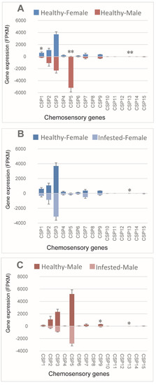 Sex-specific expression of CSPs was assessed in healthy M. saltuarius (Figure 3A), and three CPSs were expressed differently between sexes; two of these (CSP1 and CSP13) showed higher expression in females, and one (CSP5) showed extremely high expression in males. Infestation with B. xylophilus slightly affected CSP expression, only CSP13 in female (Figure 3B), and CSP9 and CSP13 male (Figure 3C) were down-regulated in the infested beetles (please see supplementary Table S2).