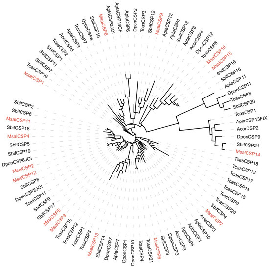 A phylogenetic tree of CSPs was constructed based on orthologs to CPS sequences from M. saltuarius, S. bifasciatus, T. castaneum, A. corpulenta, A. planipennis, and D. ponderosae (Figure 4). The identified CSPs from M. saltuarius were homologous to CSPs of Coleopteran insects whose genomic information were available, indicating relative complete identification of CSPs from M. saltuarius.