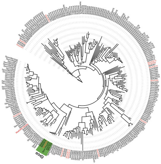 A phylogenetic analysis of ORs was performed based on the OR sequence orthologs from M. saltuarius, S. bifasciatus, A. corpulenta, A. planipennis, and D. ponderosae (Figure 6). Generally, almost all M. saltuarius ORs found orthology to other Coleoptera ORs, including the insect OR obligatory co-receptor, Orco. However, the total number of M. saltuarius ORs may have not been recovered due to its integrity in this transcriptomic study. This is obvious after comparison with genomic data from A. planipennis and D. ponderosae.