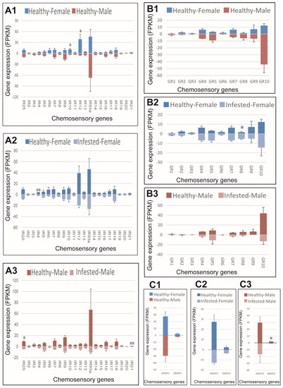 Regarding IRs, IR10 and IR12 were expressed higher in healthy females compared to healthy males, IR4 expressed higher in healthy than infested females, while IR25 and IR21 were expressed higher in healthy than infested males (Figure 7(A1–A3)). Regarding GRs, no sex bias was observed in healthy adults, and only GR8 showed higher expression in female M. saltuarius infested with B. xylophilus (Figure 7(B1–B3)). GR8 was the only up-regulated chemosensory gene in M. saltuarius infested with B. xylophilus. Regarding SNMP, no sex bias was observed in healthy M. saltuarius and SNMP2 showed lower expression in infested males than in healthy ones (Figure 7(C1–C3)).
