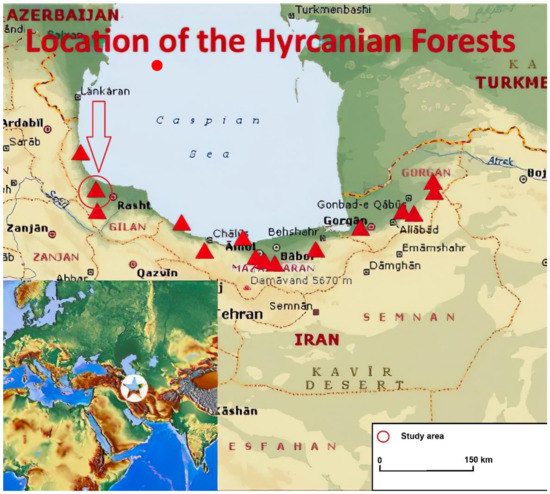 The Hyrcanian (Caspian) forests with an area of 2 million ha are located between −20 and 2200 m a.s.l. in the north of Iran (south of the Caspian Sea). The Hyrcanian forests encompass various forest types including 80 woody species (trees and shrubs). They are suitable habitats for a variety of hardwood species. The natural dense stands are found at 1000–2100 m and the best stands at 900–1500 m a.s.l. [47].