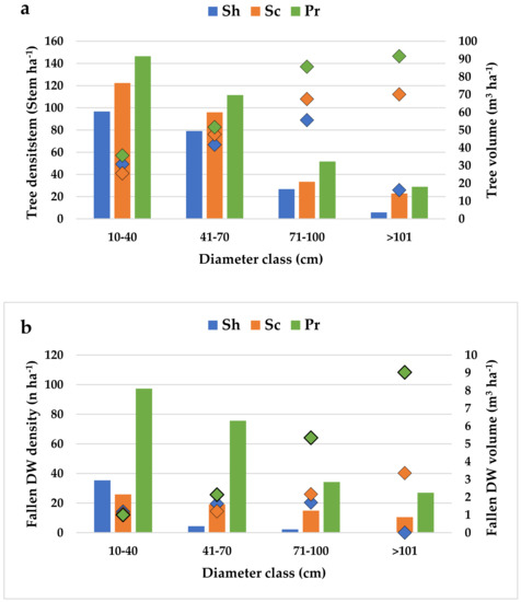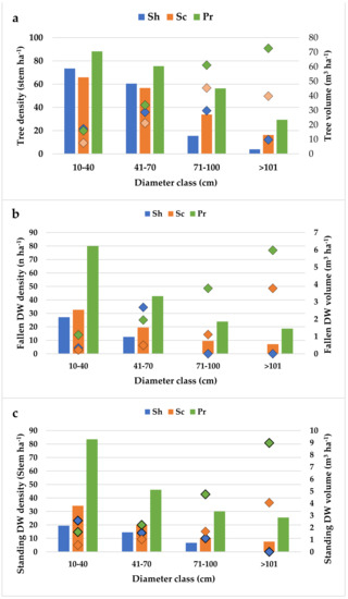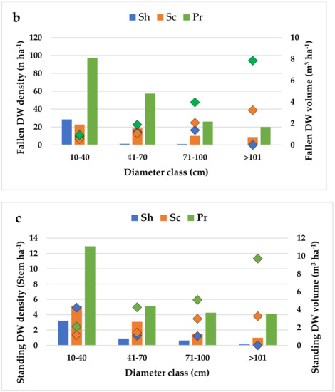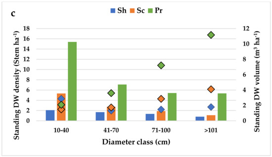 In all three stands, the highest frequency of standing DW was in the small diameter class, while the highest volume of standing DW were in the largest diameter class, but there was none in the Sh (Figure 3). In all diameter classes, the frequency of standing DW was higher in the Pr stand than in the Sc stand, and it was higher in the Sc stand than in the Sh stand.