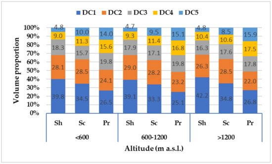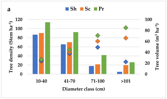 As already observed at altitudes between 600 and 1200 m, the structure of the stands was unevenly aged and tree frequency decreased with increasing diameter class, while tree volume increased with increasing diameter class (Figure 3). Frequency and volume of trees were higher in the Pr stand than in the Sc and Sh stands in all diameter classes.
