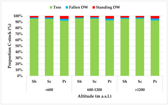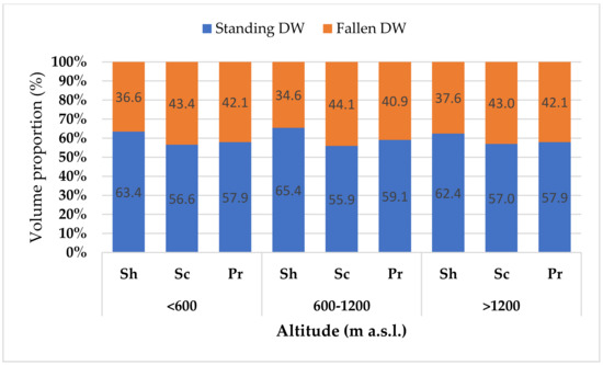 Both the fallen and standing volume of DW in the Pr stand were more than twice that in the Sc stand and more than three times that in the Sh stand (Table 11). The volume of fallen, standing, and total DW decreased in all three stands with the increasing degree of decay, such as at lower altitude classes.
