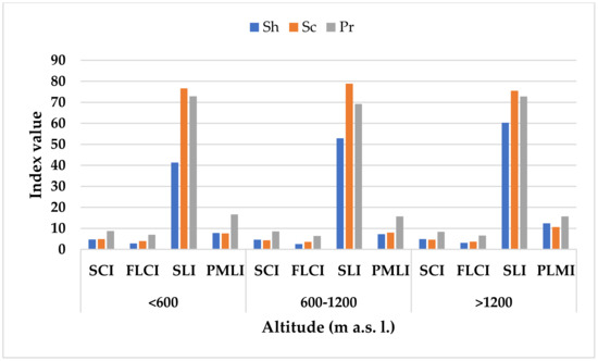 At altitudes above 1200 m, more than 80% of the number of trees and more than 60% of the volume of trees consisted of four species of beech, hornbeam, alder and maple (Table 10). As at lower altitudes, the frequency and volume of all tree species were significantly higher in Pr stand than in the Sc stand, and they were significantly higher in the Sc stand than in the Sh stand.