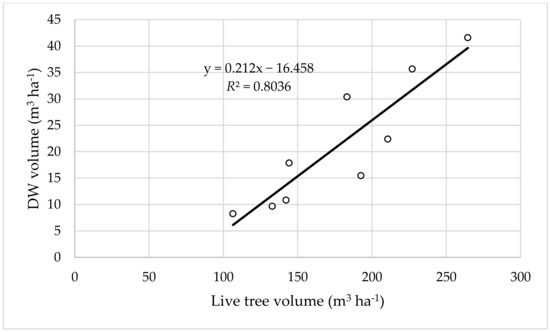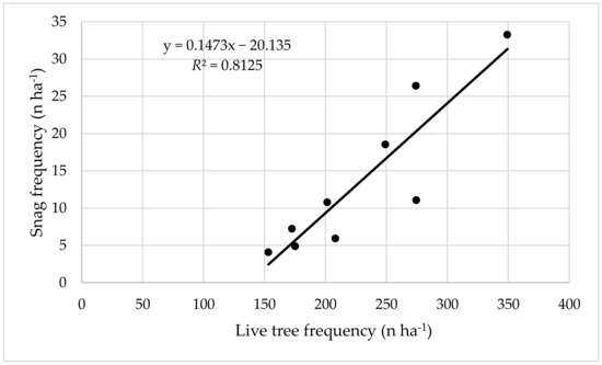 - Woodall, C.W.; Westfall, J.A. Relationships between the stocking levels of live trees and dead tree attributes in forests of the United States. For. Ecol. Manag. 2009, 258, 2602–2608. [Google Scholar] [CrossRef]