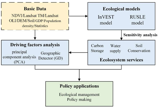 The modified Morris screening method was used to analyze the sensitivity of parameters required for model calculation. Components of the InVEST model and the Revised Universal Soil Loss Equation (RUSLE) model were jointly applied to measure the ESs of Beijing. The InVEST model was used to evaluate the ESs of carbon storage and water yield, and the RUSLE model was used to evaluate soil conservation in the region. Then, we calculated the change values for the three ESs from 1985 to 2020, collected and sorted the meteorological, ecological, and socio-economic driving factors, selected eight driving factors through principal component analysis (PCA), and analyzed the driving mechanism of each service change through the Geographical Detector (GD) method. The structure of our study is shown in Figure 2.