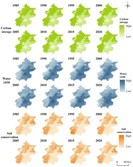 The spatial distribution and changes in ESs in different periods from 1985 to 2020 are shown in Figure 4. The high-provision areas of carbon storage and soil conservation services were mainly located in the northern, western, and southern regions, which were the main areas for woodland and grassland in Beijing; these areas had high carbon storage and low soil loss. The low-provision areas of carbon storage and soil conservation were distributed in the central region, which is the main urban region with low vegetation coverage. However, the distribution of water yield was opposite to that of soil conservation and carbon storage, with high-provision areas located in the central region and low-provision areas distributed in the mountainous region. This result is related to the high evapotranspiration of woodland and grassland, as areas with higher evapotranspiration have lower water production. In addition, the three service values provided by water were relatively low, and that provided by cropland was at a moderate level.
