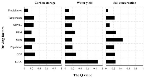 The GD results showed that the impacts of the driving factors on ESs changes were diverse (Figure 5). Four socio-economic factors had a clear influence on the ESs changes compared to other driving factors (the q value was generally greater than 0.2), but their impacts are still different. Among them, the q values of GDP and population in the change of three ESs have little difference and the NDVIm has a more significant impact on carbon storage service change among three ESs. The q values of LULC for carbon storage and water yield both exceeded 0.8, indicating that land use change caused by economic development and human activities was the most obvious driving factor of ESs changes in Beijing. The temperature has a stronger impact on ESs changes than precipitation among two meteorological factors. In addition, the slope has the most significant impact on soil conservation service change compared to other driving factors (the q value was greater than 0.4).