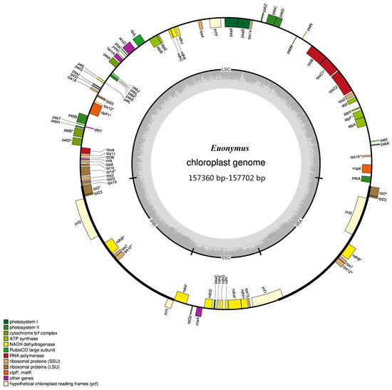 After the raw data were filtered to remove reads with low sequencing quality values, all remaining sequences were assembled into circular genomes by NOVOPlasty-v2.7.2 using the cp genome of Euonymus szechuanensis as a reference [26]. GapCloser-1.12 was employed to extend sequences and fill gaps [27]. Annotations and adjustment of the genes were conducted using the program Geneious Prime against the reference genome (https://chlorobox.mpimp-golm.mpg.de/geseq.html, accessed on 16 March 2021) [28]. Finally, a circular map of the cp genome was drawn using OGDRAW 1.3.1 (http://ogdraw.mpimp-golm.mpg.de, accessed on 16 March 2021). The newly assembled cp genome was deposited in GenBank under accession number MW771518 (https://www.ncbi.nlm.nih.gov/nuccore/MW771518.1/, accessed on 18 March 2021).