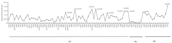 Among the 652 SNPs, 102 were distributed in 57 coding regions (exons) across the cp genome of E. maackii. The genetic diversity (π value) of these coding regions ranged from 0.00036 to 0.02703, with an average of 0.00438 (Figure 2). The coding region with the highest genetic diversity was trnV-UAC, with a π value of 0.02703, followed by petN, with π = 0.01111, and the other eight coding regions in the top ten in terms of genetic polymorphisms were psaI, ycf1, psaJ, rpsl5, rps2, rpoC1, ndhE, and ycf3. Their genetic diversity was greater than or equal to 0.00654 (Table S1, Figure 2).