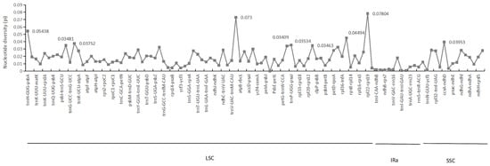 In most species, nucleotide mutations are a common type of DNA variation in the cp genome [34,35]. There were abundant nucleotide mutations (652 SNPs) in the cp genome of E. maackii, and thus it had a high level of genetic polymorphism, with an overall genetic variation of 4.1 SNPs per kb or a π value of 0.00443. This level of intraspecific sequence variation is smaller than that observed in a few plant species, such as Selaginella tamariscina (1.213 SNPs, 9.6 SNPs per kb) [21], Goodyera achlechtendaliana (740 SNPs, 4.8 SNPs per kb) [21] and Hevea brasiliensis (725 SNPs, 4.5 SNPs per kb) [23] but larger than those of most other plant species.
