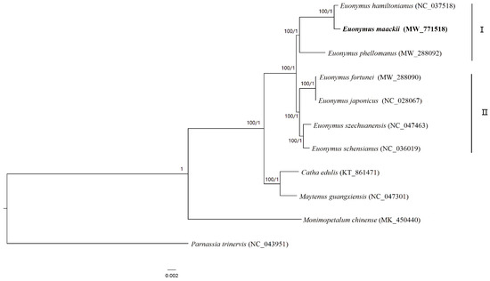 To detect the origin and differentiation of E. maackii, we constructed phylogenetic trees of 11 species based on entire cp genomes, including the newly assembled cp genome and those of 10 other species downloaded from the NCBI. Seven of the eleven species belong to the genus Euonymus, and the other four were Catha edulis, Maytenus guangxiensis, Monimopetalum chinense, and Parnassia trinervis in Celastraceae. The complete cp genomes of the 11 species were aligned by MAFFT in Geneious Prime [28], and then phylogenetic trees were constructed by the maximum likelihood (ML) and Bayesian inference (BI) methods based on their cp genome sequences using the four species outside the genus Euonymus as the outgroup.