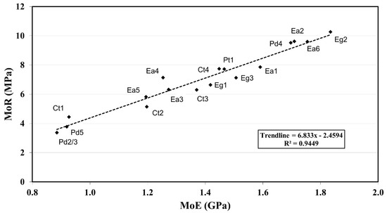 At the S/GB level, the strength properties and dimensional stability of the MDF panels varied considerably (Table 7). For example, some of the 17 S/GBs were clearly consistently better than others for the MOR–MOE relationship (Figure 1). Similar separations were noted between the 17 S/GBs for the other properties, too.