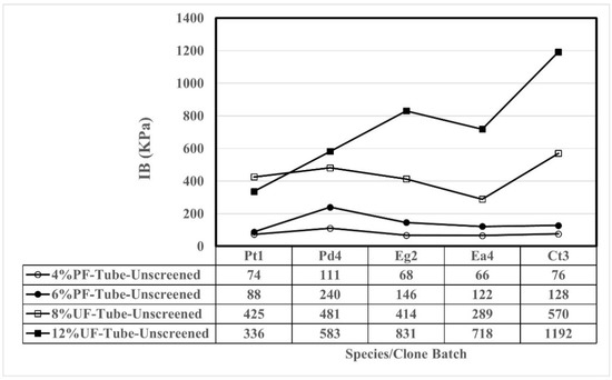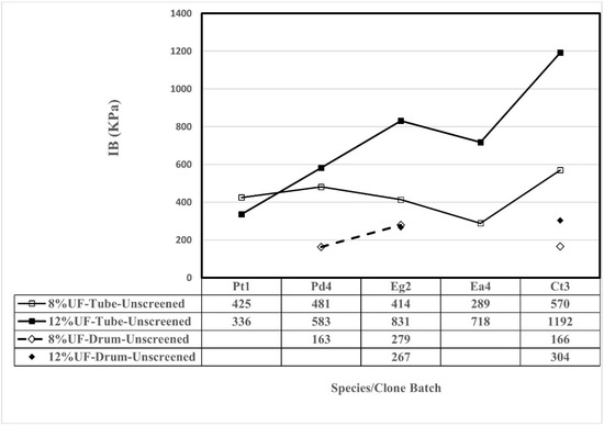 Phase II involved comparisons of the two better-performing and three average-performing S/GBs, as determined in Phase I. Phase II IB testing suggests that G/SBs behave differently to the various MDF resin systems and application rates. MDF made using a tube blender for resin application was better than that made using a rotary drum blender (Figure 2). The percentage of fines when using unscreened fiber clearly negatively influenced MDF properties (Figure 3). It was also clear that the use of UF resin was far more suitable for making better MDF than PF resin (Figure 4 and Figure 5). It is not unreasonable to think that these higher UF resin rates may be needed with these low SG woods, as such fiber density-to-MDF performance ratios are commonly used in commercial MDF manufacture.