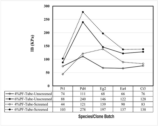 Phase II involved studying two of the “best” Phase I S/GBs (Eg2, Pd4) and three nearly average Phase I S/GBs (Ea4, Ct3, Pt1). Using TMP fiber from the earlier pulping process, another three new MDF boards were made using the same methods and processes as Phase I to hand-form and hot press a 1810 g, 406 × 406 × 12.5 mm MDF board with a target SG of 0.72. These Phase II evaluations specifically compared the use of tube or drum blenders, determined the effect of using unscreened or screened fiber, and compared the use of PF resin at 4% or 6% with UF resin (GP789D16, 47% solids, typical of those used at the FPL [25,26]) at 8% or 12%. The various effects of these different MDF processes were determined using from one to five IB samples per S/GB (Table 2).