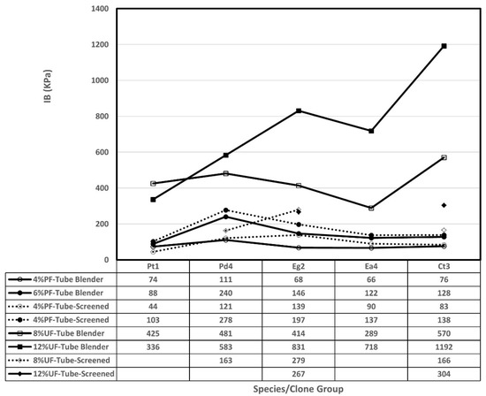 Influence of UF resin at 8% or 12%, two blender types, and five S/GBs on IB in Phase II.