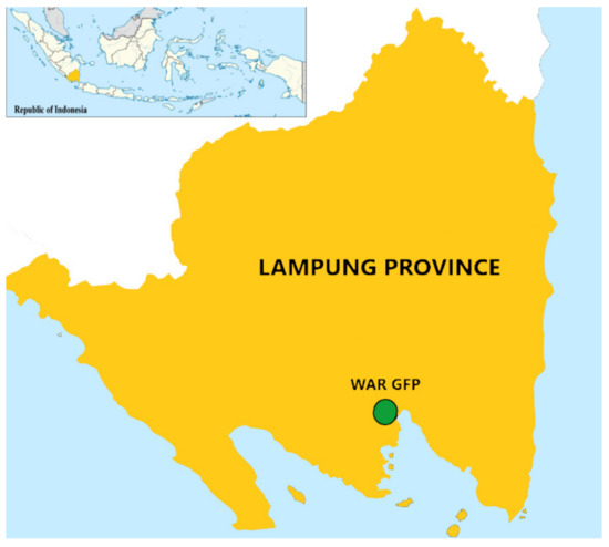 Forest conversion to monoculture cash cropping, the use of fertilizers and pesticides, and high-yielding varieties in order to maximize production influence the diversity of flora and fauna [3]. Currently, the existing protected areas are not sufficient to overcome the biodiversity crisis [4,5]. The international community is continuing to work to improve protected areas that can significantly increase biodiversity. In Indonesia, there are two categories of protected areas for biodiversity and environmental service conservation purposes, i.e., protected forests and conservation forests. In terms of the level of protection, conservation forests have a higher level of protection than protected forests. A grand forest park (GFP) is a conservation forest that is managed at the provincial level; it functions as a life support system and preserves the diversity of flora and fauna and the uniqueness of natural phenomena. Wan Abdul Rachman Grand Forest Park (WAR GFP) is a conservation forest of 22,245.50 ha that is located in Pesawaran District, Lampung Province, Sumatera, Indonesia [6]. The forest cover in WAR GFP declined significantly in the 1994–2000 period (from 9090.11 ha in 1994, to 6288.71 ha in 1997, and 5428.74 ha in 2000) [7]. There were 39 villages located adjacent to WAR GFP. Cutting and clearing the forest in WAR GFP to cultivate crops was started by transmigrants from Java when the area was managed as Gunung Betung Protection Forest (GBPF) [8]. Since the 1950s, people have lived in and around the GFP and taken advantage of the forest land to grow annual crops for economic gain [9,10]. Conversion of forest to agricultural land has a negative impact on the ecosystem, including changing the biological, physical, and chemical properties of the soil [11]. This increases pressure on the forest cover. In addition, forest fires and illegal logging have occurred frequently [12].