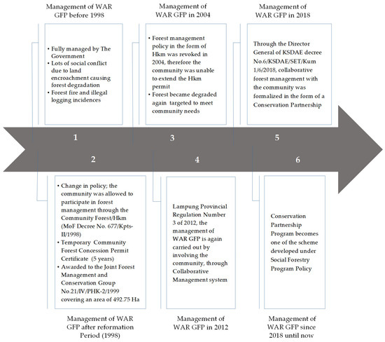 As previously stated, the involvement of the local community began in 1998 with the issuance of Ministerial Regulation No. 677 on the Community Forestry, although the program only ran temporarily. In 2012, through Provincial Regulation Number 3, a collaborative management scheme aiming to accommodate community needs and prevent future damage was developed inside the WAR GFP. With this strategy, land cover in WAR GFP increased significantly. An agroforestry cropping pattern was developed, with a combination of rubber, cocoa, MPTS, and forest tree species. Communities were able to take advantage of nontimber forest products (NTFPs) to ensure their welfare, and woody plants were planted to preserve the forest. In 2018, collaborative management with the local community was strengthened by the issuance of the Conservation Partnership Program through Director General KSDAE (Natural Resources and Ecosystem Conservation) Decree No 6/KSDAE/SET/Kum.1/6/2018. The Conservation Partnership is also one of the schemes developed under the Social Forestry Program as a policy umbrella for community involvement in forest management (Figure 2).
