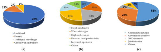 Factors driving the community to develop the agroforestry system in the WAR GFP can be classified into three aspects: social-economic-cultural, ecology, and stakeholder initiative aspects. For the social-economic-cultural aspects, livelihood was the most important driving factor for 78% of the respondents (Figure 3a). As regards the ecological aspect, the most essential driving factors were reduced land productivity, water shortages, and high soil erosion, which were reported by about 19% to 22% of respondents (Figure 3b). For the stakeholder initiative aspect, community initiative was the most important driving factor (as stated by 51% of respondents), followed by the government initiative (as stated by 28% of respondents (Figure 3c)).