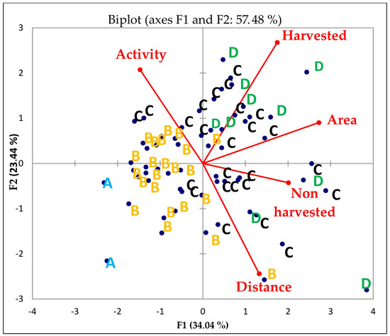 Principal component analysis (PCA) [30] was used to analyze the correlation between the group of respondents who practiced agroforestry in the area and the variables that potentially influenced factors, such as plot size managed by each farmer, distance from farmer’s settlement to the agroforestry plot, farmer activities (on-farm and off-farm), and amount of harvested and non-harvested plants. The following four groups based on the number of species cultivated in the plot were used in the analysis: (A) 1–4 species cultivated, (B) 5–8 species cultivated, (C) 9–12 species cultivated, and (D) 13–16 species cultivated. The grouping number of species cultivated in the plot was determined based on the total number of species cultivated by all 59 respondents. Frequency, relative to all respondents, was used based on the condition trend of the environment, biodiversity, and socio-economic indicators to measure the impact of agroforestry systems.