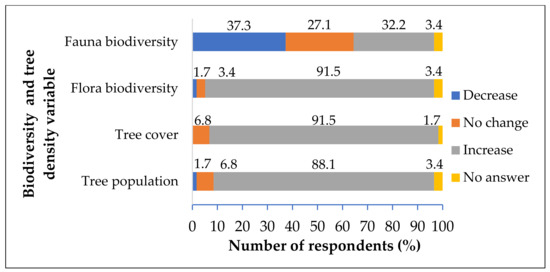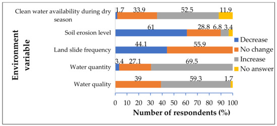 As compared to the last two decades, considering that agroforestry had just been established by the community in 2000, more than 50% of the respondents mentioned that the environment indicators had improved (Figure 6). The availability of clean water increased, the level of soil erosion decreased, water quality and quantity increased, while landslide frequency remained the same. Most of the respondents (>88%) noticed that the agroforestry that they practiced in the plot had significantly increased the tree population, tree cover, and the diversity of flora over the two decades (Figure 7).