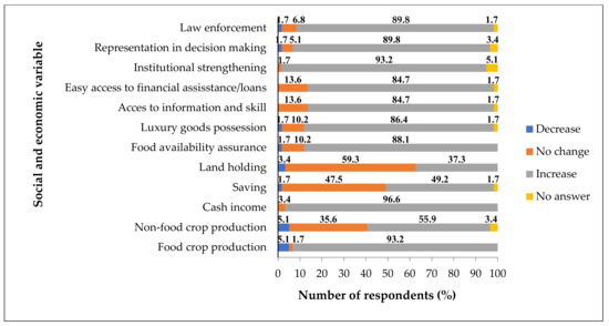More than 80% of respondents reported that food crop production, cash income, food availability, luxury goods possession, access to information and skill, easy access to financial loans, institutional strengthening, representation in decision making, and law enforcement had improved (Figure 8). However, agroforestry was considered to have no impact on savings and the size of land ownership.