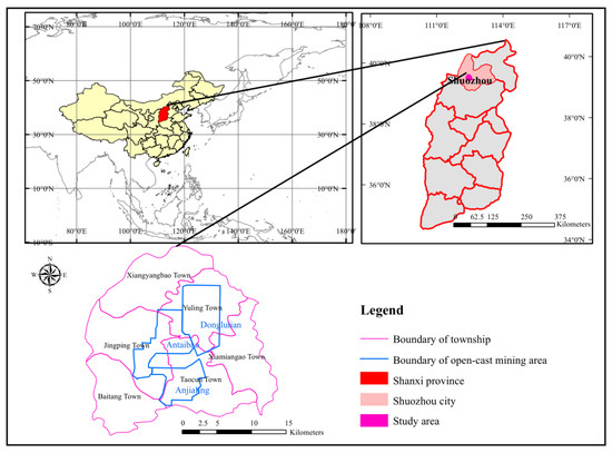 According to the administrative division, the study area encompasses Jingping Township, Xiangyangbao Township, Baitang Township, Yuling Township, Taocun Township, and Xiamiangao Township. The key industries in this study area include mineral resource exploitation, processing and service industries, agricultural production, and biological resource utilization. As a large-scale centrally developing coal mine in China [22], the mining area is 23 km long and 22 km wide, with a prospecting area of 380 km2 and proven geological reserves of 12.75 billion tons. At present, there are three national oversize open-cast mines, namely Antaibao open-cast mine, Anjialing open-cast mine, and East open-cast mine [23].