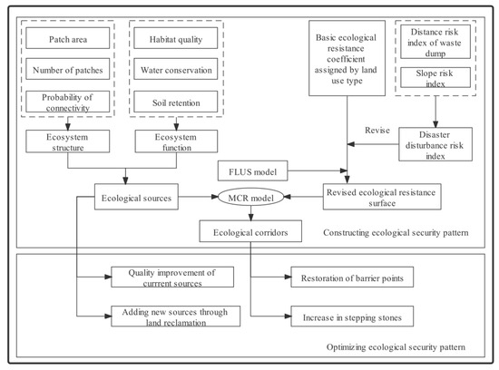 Mineral resources are an important and basic part of promoting economic development and social progress [1]. However, intensive mining activities have changed the characteristics of the land surface, destroyed the natural vegetation, and led to landscape fragmentation, connectivity decline, and biodiversity loss [2]. Due to this over exploitation, China has large tracts of damaged land, resulting from excavation, collapse, and occupation [3], which have caused the loss of regional natural ecosystems and the degradation of ecosystem functions. Therefore, understanding how to achieve stable ecosystems and enhance the functioning of the ecosystems in mining areas is imperative. Potential spatial pattern, called ecological security pattern (ESP), exists in landscapes. This is composed of strategic portions of, and positions in, a landscape that have critical significance in safeguarding and controlling certain ecological processes [4]. According to the feedback from the landscape pattern and ecological process, the ESP is an effective approach for supporting biological species, maintaining natural ecological processes, improving regional ecological security, and achieving ecological security [5,6]. At present, the construction of an ESP mainly consists of three parts: identifying ecological sources, constructing ecological resistance surfaces, and extracting ecological corridors.