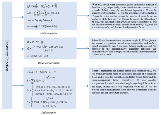 As shown in Figure 3, habitat quality refers to the ability of the ecosystem to provide appropriate conditions for individual and population persistence [30], and plays an essential role in the effectiveness of the biodiversity conservation status [31,32,33]. The InVEST model was used to assess the habitat quality in the study area, and was estimated based on information concerning land use/land cover and threats to biodiversity. In this study, stress factors included cultivated land, construction land, damaged land, and various parameters. The maximum influence distance, weight, spatial decay type, and sensitivity were determined specifically from the literature [8,34]. Water conservation refers to an ecosystem’s retention and interception of precipitation, meaning the ability to regulate runoff and river discharge [7]. Water conservation was calculated using a water balance model in this study. Soil retention refers to indicators with the capacity to reduce soil loss and maintain soil fertility [35]. Revised universal soil loss equation (RUSLE) is an empirically based model that can forecast a long-time mean annual amount of soil erosion on a ground slope as a consequence of precipitation arrangement, topography, soil type, administration practices, and crop system, and can quantify the soil erosion risk index well. Thus, soil retention was analyzed using the RUSLE model.
