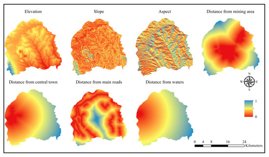 Land use and land cover change (LUCC) simulation models are effective, reproducible tools for analyzing both the causes and consequences of future landscape dynamics under various scenarios [38]. In this paper, we predicted the future ecological risk and constructed the future ecological resistance surface using a future land-use simulation (FLUS) model. The proposed model was an integration of a top-down system dynamic (SD) model and bottom-up cellular automata (CA). The SD model was used to project the land-use scenario demands under various socio-economic and natural environmental driving factors at the national/regional scale. A self-adaptive inertia and competition mechanism was developed within the CA model to process the complex competitions and interactions among the different land-use types. The specific contents of the FLUS model referred to Liu’s research [38]. In our study, the demand of all the land-use types for 2026 was projected through the configured SD model using the actual land-use pattern in 2018 and the influence of both human and natural factors during this time interval. The trained multiple CA model then simulated the local competition and interactions iteratively and generated the land-use pattern for 2026, which met the projected demand derived from the SD model. In our study, the limiting factors of the FLUS model included elevation, slope, aspect, distance from mining area, distance from central town, distance from main roads, and distance from waters (Figure 4). All of these limiting factors would affect the result of the probabilistic performance of the Artificial Neural Network (ANN). Moreover, we examined the limiting factor validity by testing the matching degree between the simulation results and the real land-use types in 2018. Comparing the real land-use types with the simulation results in 2018, the Kappa index was 0.808, which shows that the FLUS model simulated the LUCC of Jincheng in 2018 well. Thus, this model could predict further land-use patterns for 2026 in order to analyze the future ecological risk and construct an ecological resistance surface.