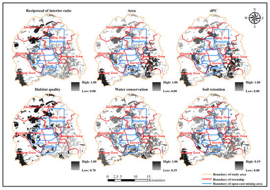 After processing the layer of land-use type data, a total of 171 potential ecological sources with an area of 147.74 km2 were identified. As shown in Figure 5, the six indicators were calculated to qualify the ecosystem structure and function of these patches. In addition, all of these indicators were considered when selecting ecological sources. From the perspective of ecosystem structure, most of the potential ecological sources had a relatively high interior ratio and a small area, indicating that these potential sources were relatively small and fragmented. This was particularly so in the eastern study area, where many small patches were widely distributed, some of which lacked a core ecological area due to large edge contact areas with the outside environment. As the spatial scale of the study area was relatively small (a total of 517.48 km2), the dPC value mainly depended on the area of each patch; a patch with large area tended to get a high dPC value. Overall, the high dPC value areas were located north of the mining boundary and south of the study area.