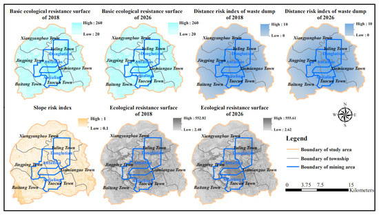 Basic ecological resistance coefficients for cultivated land, forest land, grassland, water, construction land, and damaged land were assigned values of 120, 20, 80, 20, 240, and 260, respectively. The specific resistance coefficients were determined using an expert scoring method based on existing research [8,12]. The ecological risk index was established by comprehensively considering the effects of the slope risk and mine distance risk indexes. As the major element of geomorphic characteristics, slope has a prominent impact on soil erosion. Generally speaking, a steeper slope triggers stronger soil erosion. Therefore, a steep slope was assigned a higher risk value in this study. The slope risk index was calculated by assigning risk values based on the natural breakpoint method. This divided the study area into 10 internals: 0–3.1°, 3.1–5.3°, 5.3–7.3°, 7.3–9.5°, 9.5–11.9°, 11.9–14.8°, 14.8–18.6°, 18.6–23.6°, 23.6–31.1°, and >31.1°. Corresponding risk values were assigned as 1, 2, 3, 4, 5, 6, 7, 8, 9, and 10. As a significant element of the damaged land, waste dumps occupied numerous parts of the study area, which resulted in less biodiversity, water and soil erosion, and land degradation [36]. Furthermore, the waste dump was the highest ecological risk region in the Pingshuo open-cast area [37]. Generally, the adverse impacts on the surrounding environment were inversely proportional to the distances to the waste dumps. Thus, buffer radii of 1, 2, 3, 4, 5, 6, 7, 8, 9, and 10 km from each large waste dump were used to construct multiple buffer zones. This study divided the research area into 11 regions: 0–1 km, 1–2 km, 2–3 km, 3–4 km, 4–5 km, 5–6 km, 6–7 km, 7–8 km, 8–9 km, 9–10 km, and >10 km from each large waste dump. A larger waste dump indicated a larger impact on the surroundings. Therefore, the ratio between a single waste dump area and the total waste dump area in the study region was used to judge the disturbance capacity of each dump. A larger ratio indicated a larger mine distance risk value. The spatial distribution of the mine distance risk index was obtained with the inverse distance weighted.